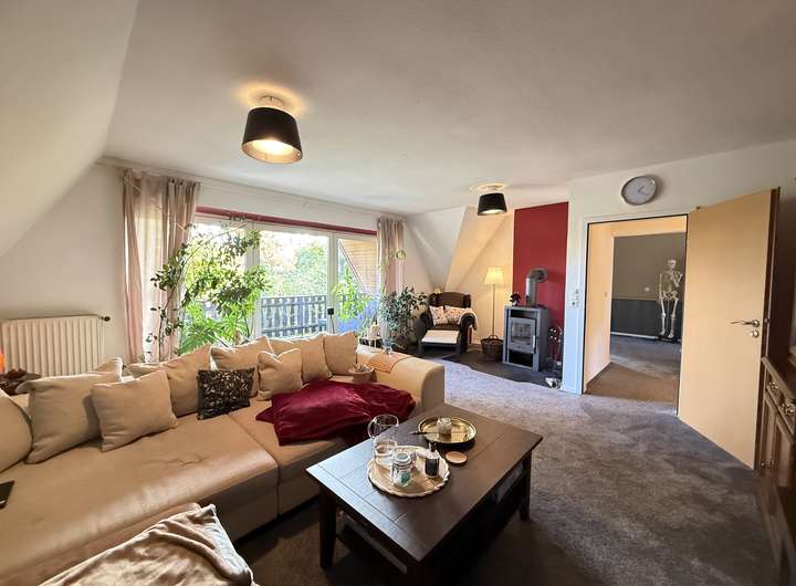 Das voll ausgebaute Dachgeschoss mit Dachausbauten und Dachflächenfenstern fügt sich harmonisch in die Dachform im Landhausstil ein. Besonders hervorzuheben sind die gedielten Spitzbodenbereiche sowie die großzügige Loggia mit Holzgeländer, die einen herrlichen Ausblick in die umliegende Landschaft ermöglichen.