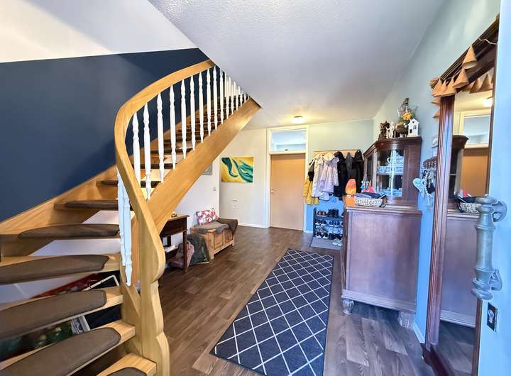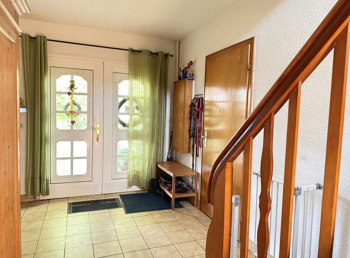 Im gesamten Haus sind Kunststofffenster mit Isolierverglasung verbaut. Die beiden Hauseingangstüren im Landhausstil unterstreichen den warmen, wohnlichen Charakter. Eine großflächige Hebe-Schiebetüranlage im oberen Wohnbereich führt direkt zur Loggia. Zwei Treppenanlagen mit Holzstufen und Holzgeländern verbinden die Etagen harmonisch miteinander.
