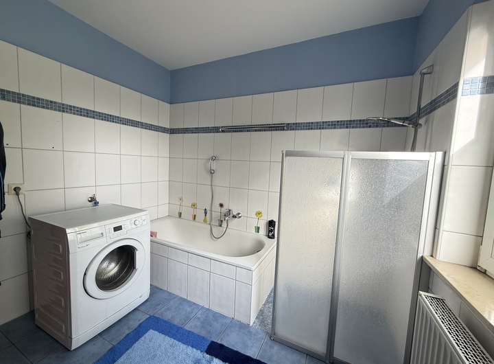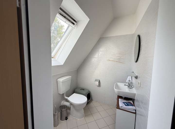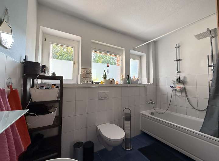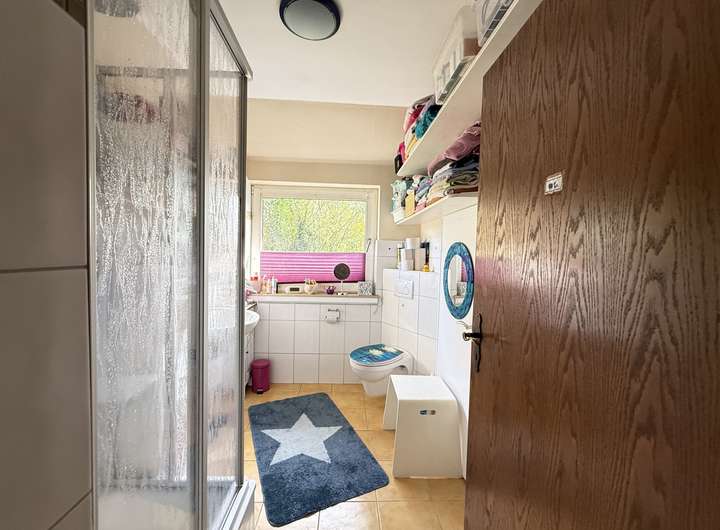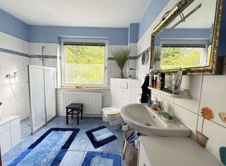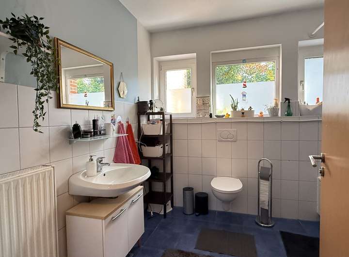 In den Bädern im Erdgeschoss finden sich Wand- und Bodenfliesen, Badewanne, Dusche, Waschbecken und WC. Das Badezimmer im Obergeschoss ist mit weißen Fliesen, Dusche, Waschbecken und WC ausgestattet. Zusätzlich steht ein separates WC im Obergeschoss mit heller Fliesenausstattung zur Verfügung.