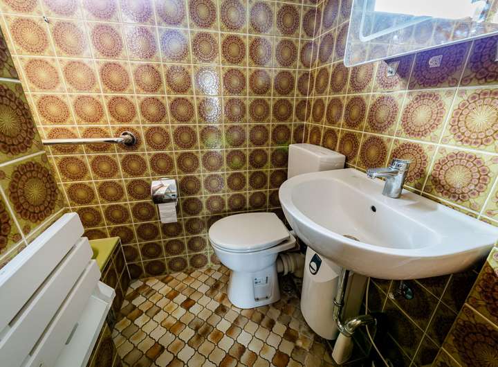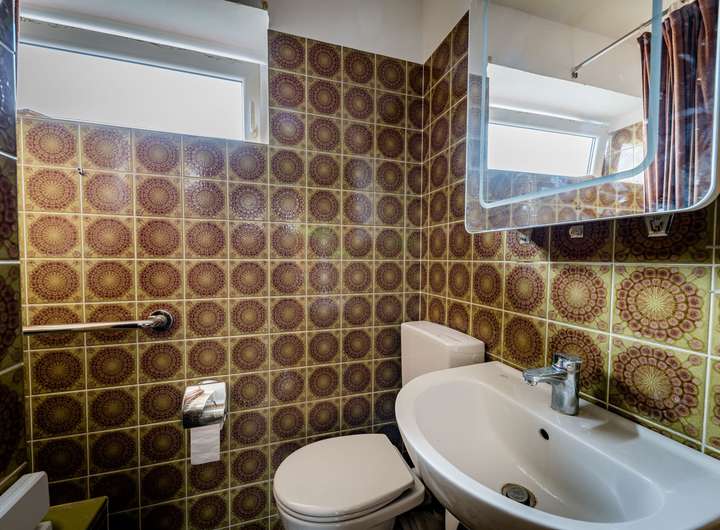 Der massiv gebaute Keller, typisch für die Ernst-May-Häuser, bietet neben großzügigem Stauraum auch ein zusätzliches Badezimmer mit Badewanne.