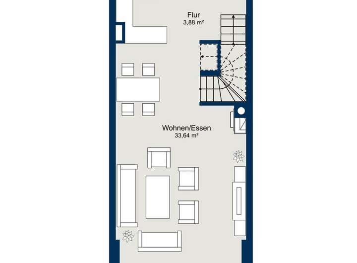 Das Herzstück des Hauses ist der großzügige Wohnbereich, der direkt auf die einladende Terrasse führt. Hier können Sie entspannte Abende genießen oder gesellige Momente mit Freunden und Familie verbringen.