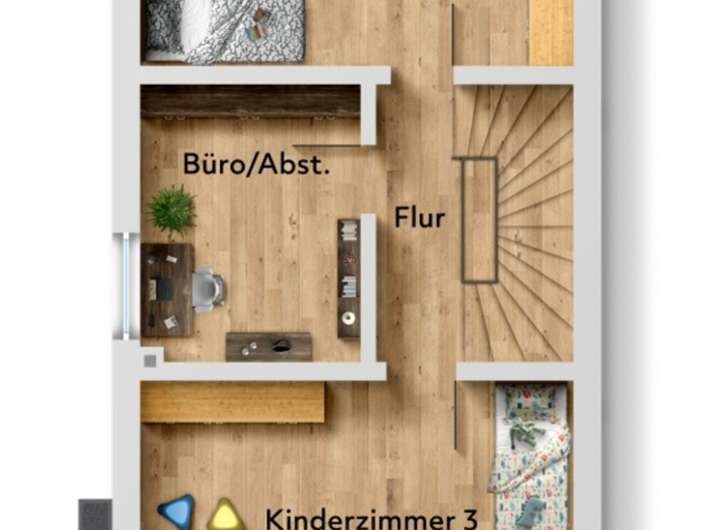 Im Obergeschoss befinden sich zwei komfortable Schlafzimmer, ein modernes Tageslichtbad mit Wanne und Dusche sowie ein Abstellraum. Das ausgebaute Dachgeschoss bietet zusätzlichen Platz mit zwei weiteren Zimmern – ideal als Kinder-, Gäste- oder Arbeitszimmer – sowie einem weiteren Raum, der sich flexibel als Büro oder Stauraum nutzen lässt.