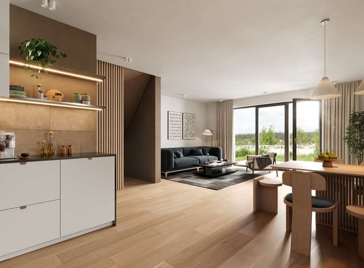 Im Erdgeschoss überzeugen die Häuser mit einem offenen Wohn- und Essbereich samt integrierter Küche und direktem Zugang zur Terrasse und in den Garten. Ergänzt wird das Erdgeschoss durch ein Gäste-WC, eine Diele sowie einen praktischen Hauswirtschafts- und Technikraum.