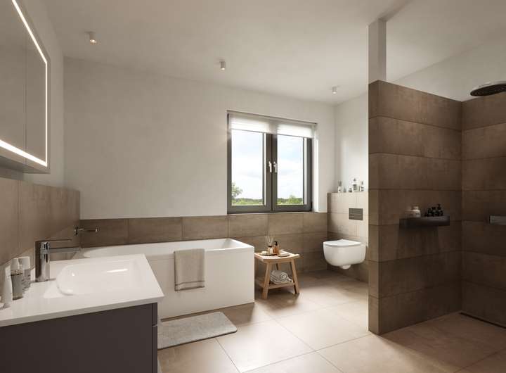Im Erdgeschoss überzeugen die Häuser mit einem offenen Wohn- und Essbereich samt integrierter Küche und direktem Zugang zur Terrasse und in den Garten. Ergänzt wird das Erdgeschoss durch ein Gäste-WC, eine Diele sowie einen praktischen Hauswirtschafts- und Technikraum.