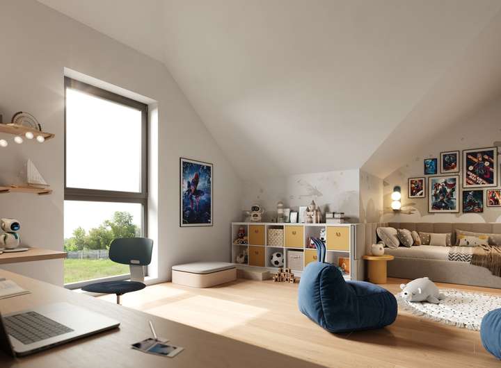Im Obergeschoss befinden sich zwei komfortable Schlafzimmer, ein modernes Tageslichtbad mit Wanne und Dusche sowie ein Abstellraum. Das ausgebaute Dachgeschoss bietet zusätzlichen Platz mit zwei weiteren Zimmern – ideal als Kinder-, Gäste- oder Arbeitszimmer – sowie einem weiteren Raum, der sich flexibel als Büro oder Stauraum nutzen lässt.