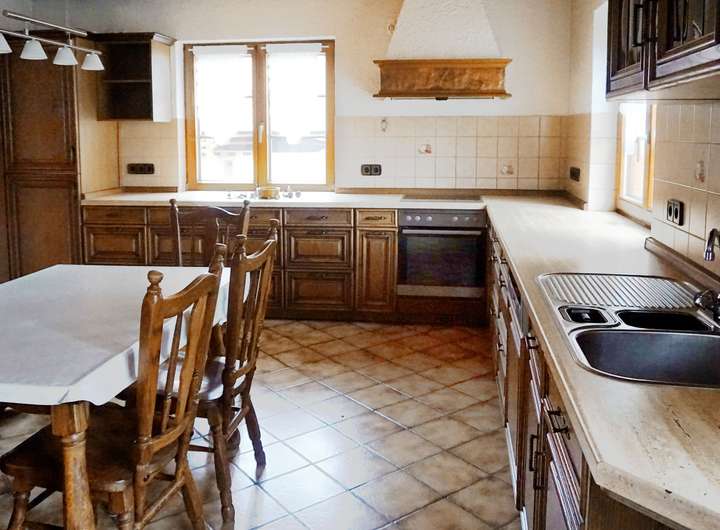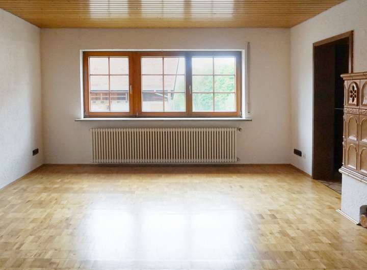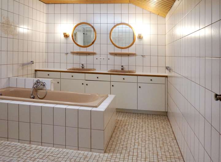 Das großzügige Bad bietet eine freistehende Wanne, separate Dusche und eine geschmackvolle Waschtischanlage. Die Elektroinstallation ist auf aktuellem Stand, die Ölzentralheizung (Bj. 1990) sorgt zuverlässig für Wärme und Warmwasser.