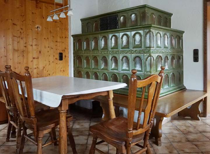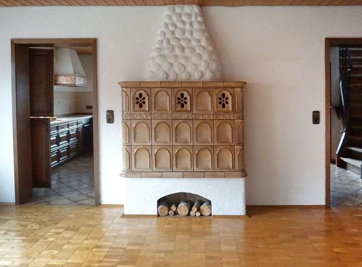 Ein zentrales Highlight ist der große, moderne Kachelofen, der Küche und Wohnzimmer angenehm beheizt. Im Flur sorgt eine stilvolle Feuerstelle – mit integrierter Holzlagerung – für zusätzliche Wärme und Atmosphäre.