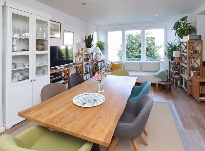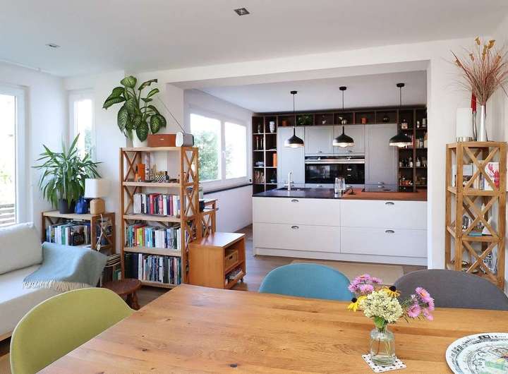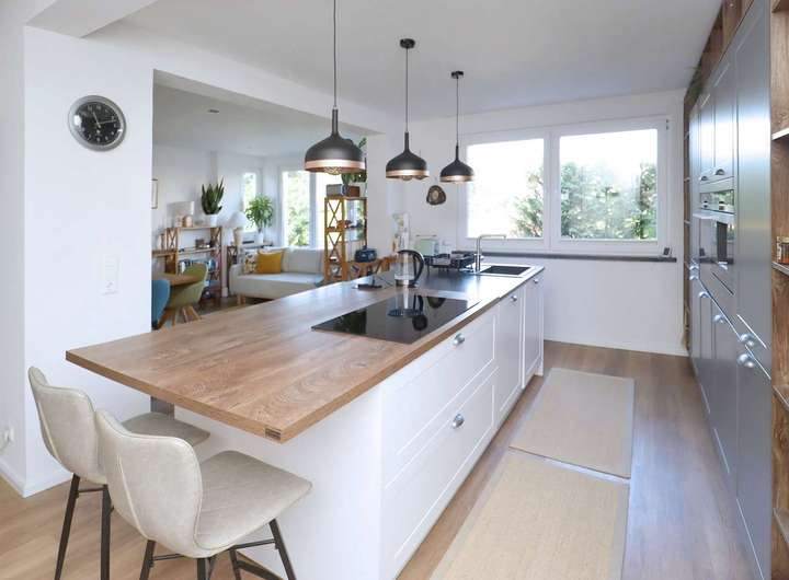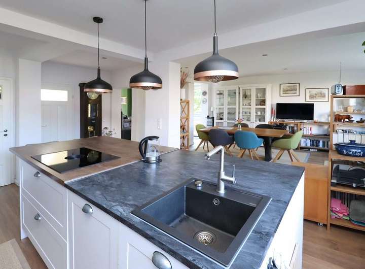 Die moderne Küche mit zentraler Kochinsel und zahlreichen durchdachten Details ist das Herzstück des Hauses und lässt keine Wünsche offen – hier trifft Funktionalität auf Design. Vom Wohnbereich aus gelangen Sie direkt auf die sonnige Terrasse und in den liebevoll neu angelegten Garten.