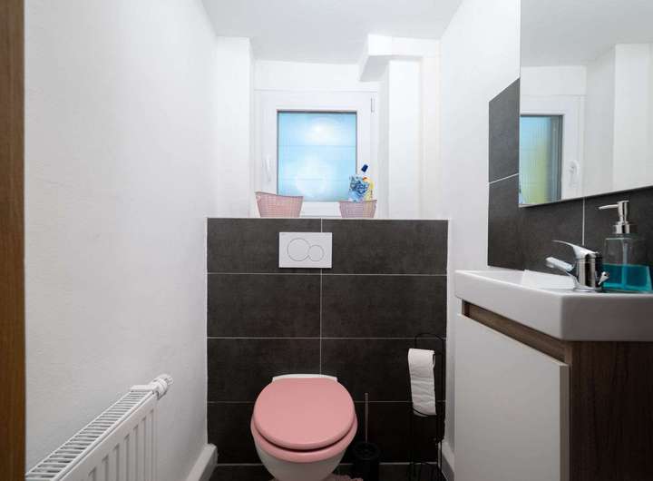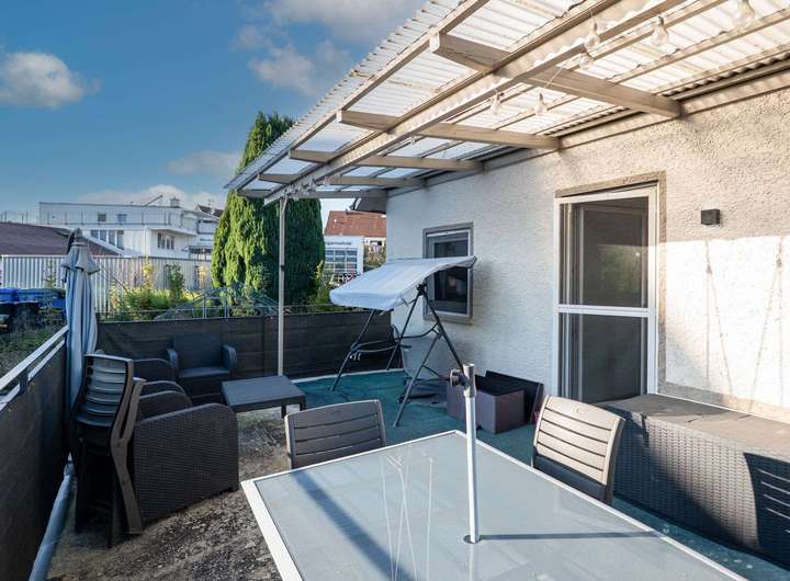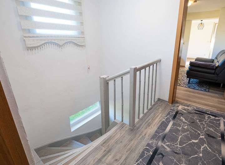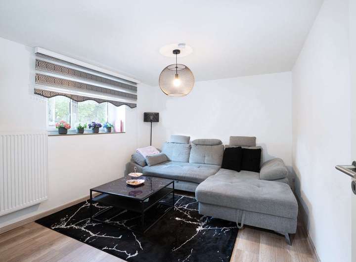 Das Badezimmer ist mit einem pflegeleichten Vinylboden ausgestattet, während in den Wohnräumen Laminat verlegt wurde – ideal für eine warme Wohnatmosphäre. Der Wohnbereich bietet Zugang zur Terrasse, auf der Sie sonnige Stunden genießen können. Zusätzlich lädt ein Balkon im Obergeschoss zum Verweilen ein.