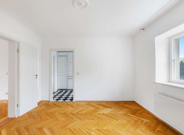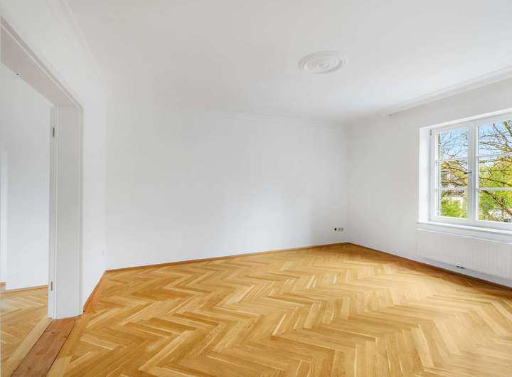 - Fischgrätparkett im Hochparterre, Ober- und Dachgeschoss (ausgenommen Küche und Bäder); Cotto-Fliesen im Gartengeschoss