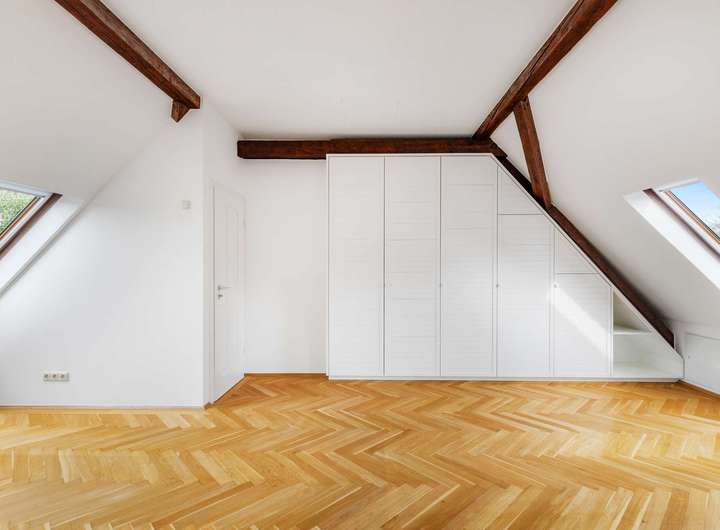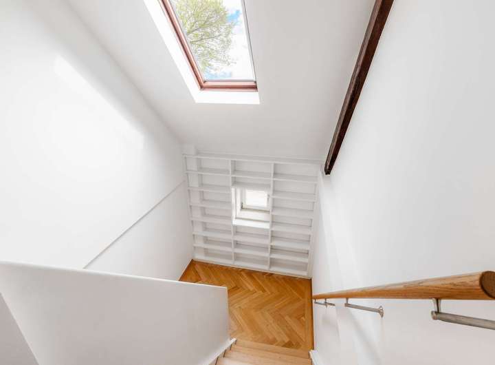- Maßeinbauten: Bücherregale auf dem Treppenabsatz zwischen Ober- und Dachgeschoss sowie im Dachgeschoss; Kleiderschrank im Masterschlafzimmer (Dachgeschoss)
