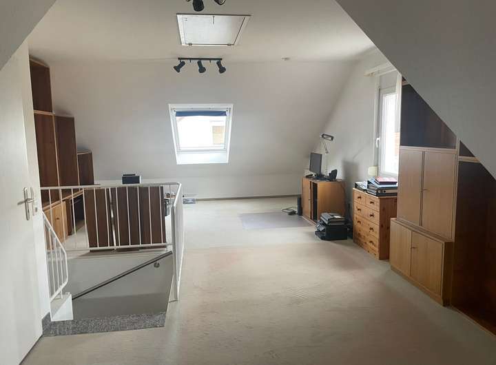 Das Tageslichtbad mit Wanne und Dusche sorgt im Obergeschoss für Komfort und Helligkeit. Ein besonderes Highlight ist das ausgebaute Dachgeschoss: Das Studio eignet sich perfekt als Rückzugsort, Arbeitszimmer oder kreativer Freiraum.