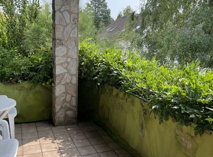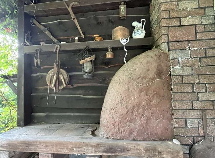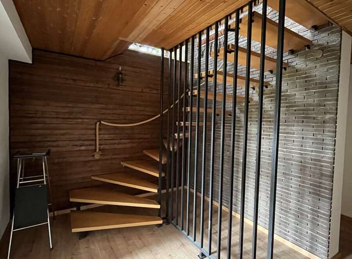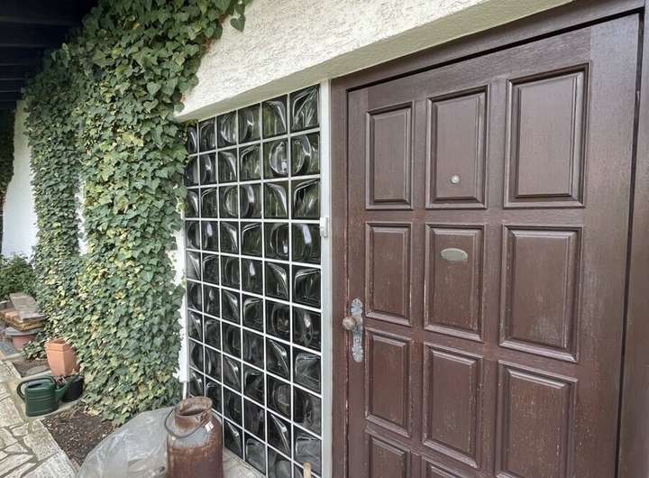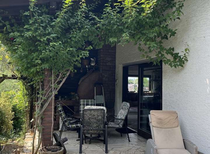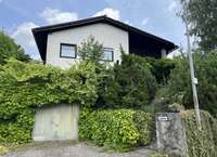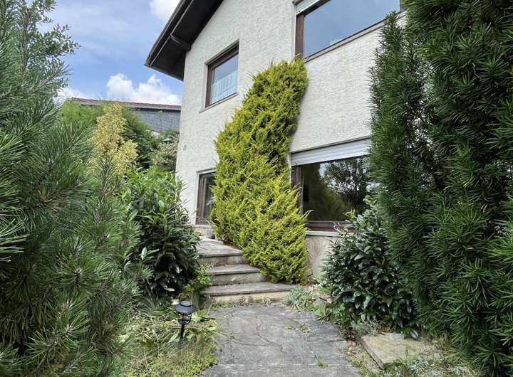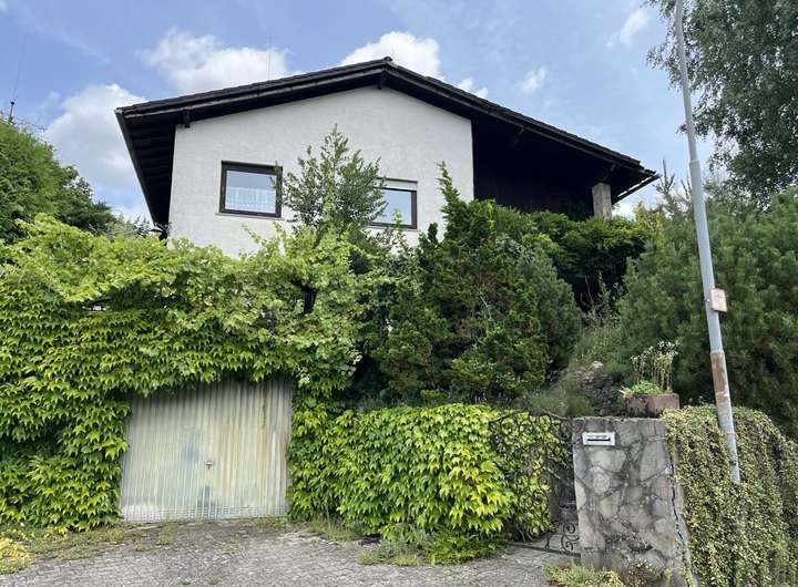 Das Haus präsentiert sich von außen mit einer charmant bewachsenen Fassade und liegt leicht erhöht, umgeben von viel Grün – ideal für Naturliebhaber.
