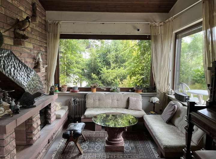 Im Erdgeschoss überzeugt die Immobilie durch ihren gemütlichen Wohnbereich mit einer offenen Kaminecke, die für eine warme und behagliche Atmosphäre sorgt. Großflächige Fenster lassen viel Licht herein und eröffnen neben einem Weitblick Richtung Taunus auch einen herrlichen Blick in den Garten. Der Wohnbereich ist großzügig geschnitten und bietet direkten Zugang zur Terrasse, die zum Entspannen und Verweilen im Freien einlädt.