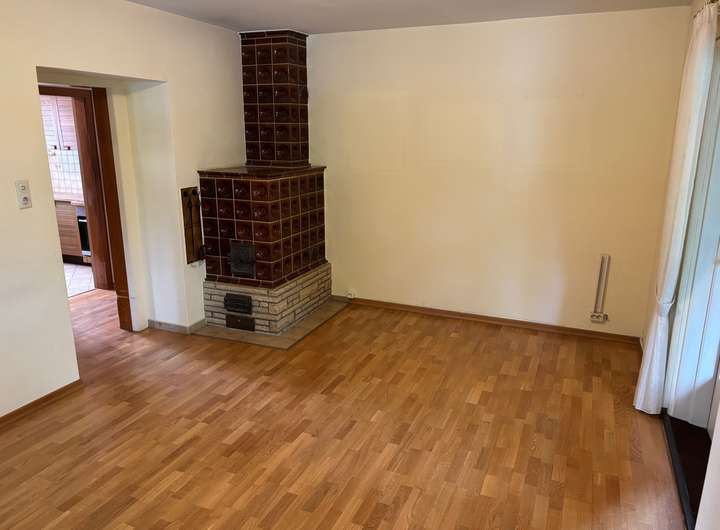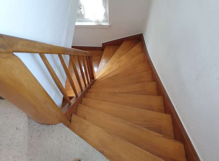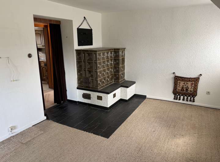 Ein echtes Highlight ist die schöne Holztreppe, die den nostalgischen Charme des Hauses unterstreicht. Zwei gemütliche Kachelöfen – einer im Wohnzimmer, der andere im Obergeschoss – sorgen für behagliche Wärme und eine wohnliche Atmosphäre.
