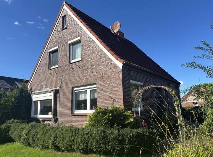 Im historischen Ortskern von Werdum bei Esens befindet sich dieses großzügige Siedlungshaus aus dem Baujahr 1960 auf einem weitläufigen Grundstück von über 1.000 m². Das Haus bietet eine klassische Aufteilung mit insgesamt zwei Wohnebenen: