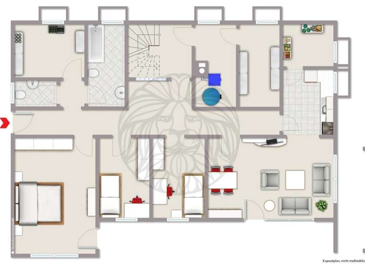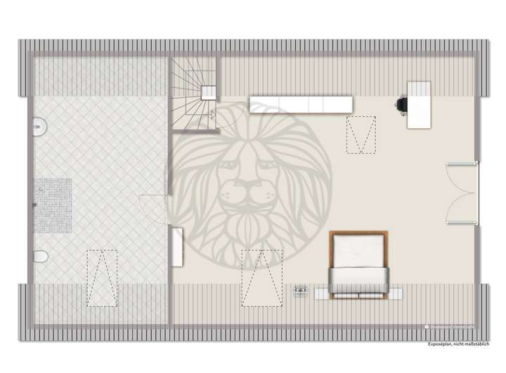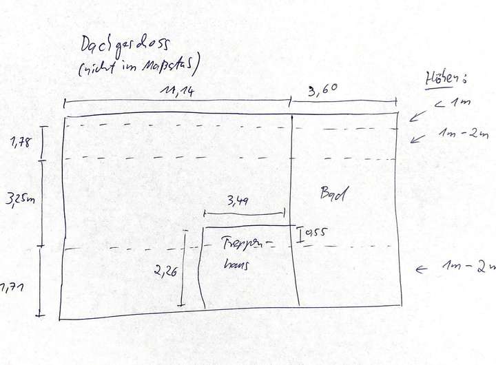 Das Erdgeschoss, in Holzständerbauweise und das später ausgebaute Dachgeschoss teilen sich wie folgt auf:
