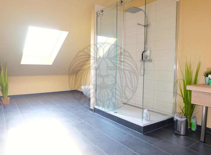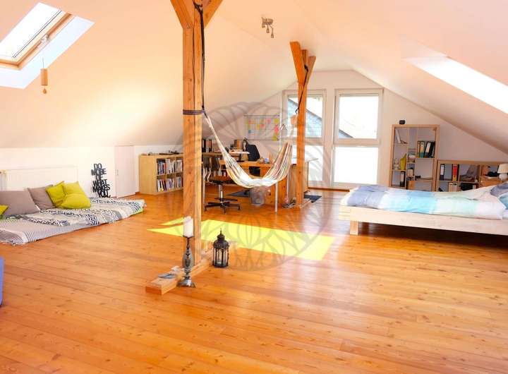 Das Erdgeschoss verfügt über zwei weitere geräumige Kinderzimmer beide mit Zugang zum Balkon, ein Tageslichtbadezimmer mit Badewanne und Dusche, ein Arbeitszimmer und ein Gäste-WC. Im Dachgeschoss, ausgebaut 2008, befindet sich das Elternschlafzimmer mit Arbeitsbereich und ein großes Tageslichtduschbad.
