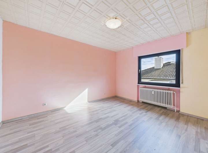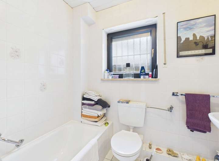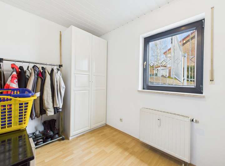 Vom Eingangsbereich gelangen Sie ins Gäste-WC und in den privaten Bereich des Hauses mit den Schlafräumen und dem Badezimmer. Zwei Kinderzimmer bieten viel Platz, während das großzügige Schlafzimmer Raum für eine gemütliche Wohlfühloase bietet. Das Tageslicht-Badezimmer ist mit Badewanne und Dusche ausgestattet.