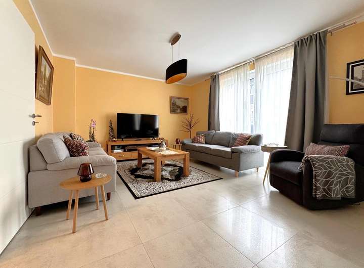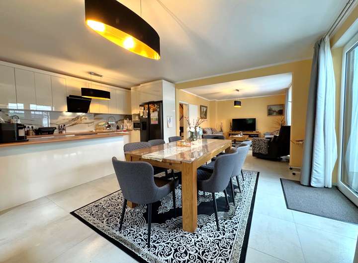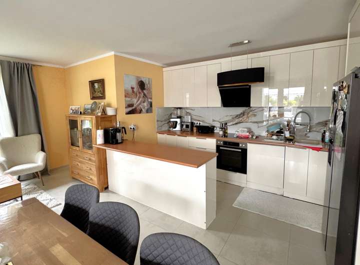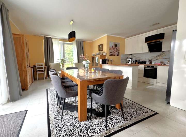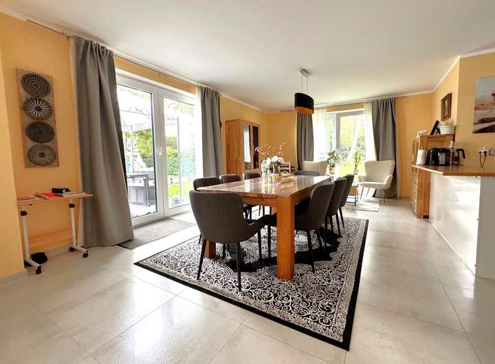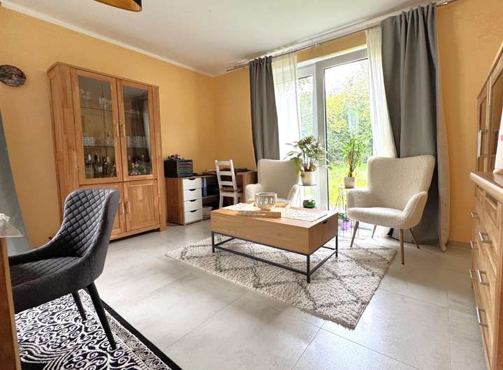 Über den freundlichen Eingangsbereich gelangen Sie in die Diele mit Zugang zum Gäste-WC mit Dusche. Herzstück ist das großzügige Wohn- und Kochzimmer mit direktem Zugang zur Terrasse und in den Garten – perfekt für Familienleben und gesellige Stunden. Eine moderne Einbauküche mit Arbeits- bzw. Esstheke ist bereits integriert. Der Hauswirtschaftsraum bietet reichlich Stauraum und einen Anschluss für die Waschmaschine.