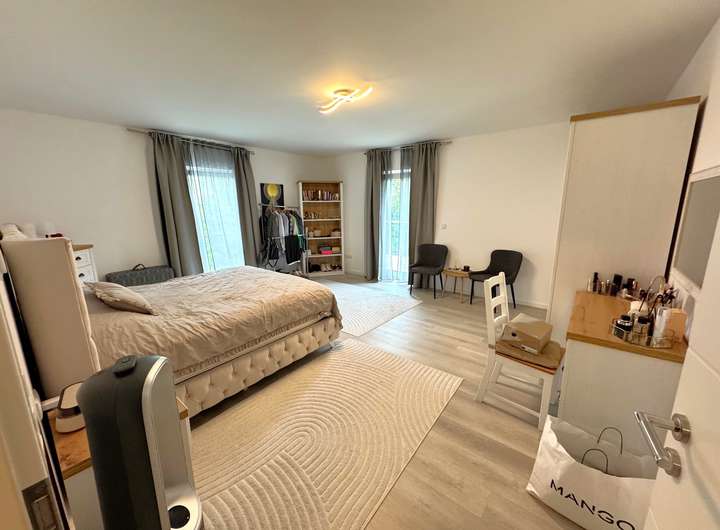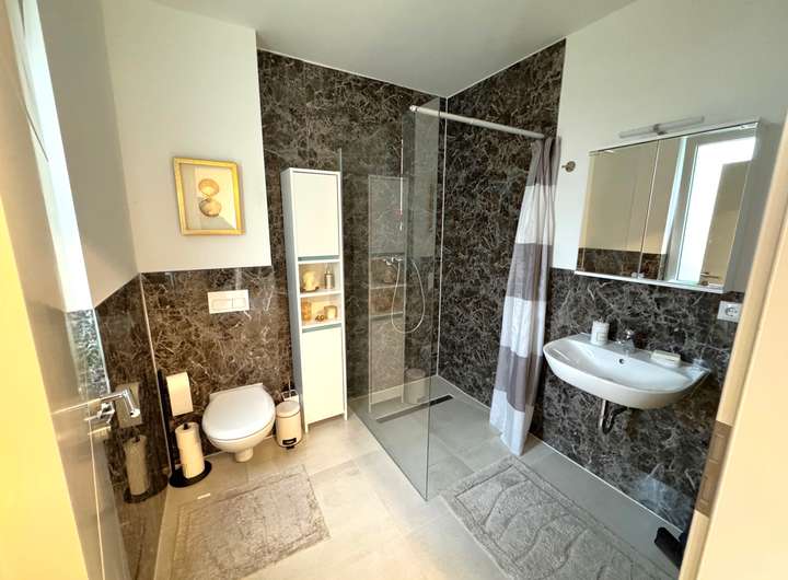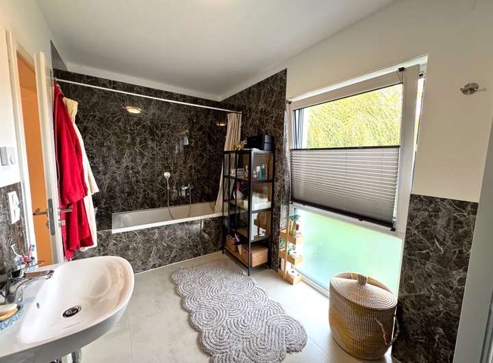 Eine massive Treppe führt ins Obergeschoss mit drei geräumigen Schlafzimmern sowie einem großzügigen Tageslichtbad mit Dusche und Badewanne. Bodentiefe Fenster sorgen in allen Zimmern für viel Licht. Das große Elternschlafzimmer verfügt zusätzlich über eine Dachterrasse.