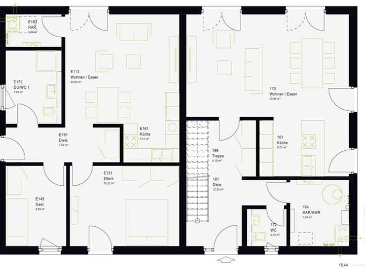 Unser FamilyStyle bietet auf einer Nettogrundfläche von 264 m² viel Raum für unterschiedlichste Wohnideen - vom Mehrgenerationenwohnen bis zur vermieteten Einliegerwohnung als Finanzierungshilfe. Möglich macht dies die Aufteilung des Hauses in eine komplette, separate Wohnung im Erdgeschoss - und das eineinhalbgeschossige Wohnen der Bauherrenfamilie, das das Erdgeschoss ausschließlich dem Lebensmittelpunkt im offen angelegten Wohn-, Ess- und Küchenbereich vorbehält. Im Obergeschoss gestatten 127 m² großzügiges Wohnen in drei Kinderzimmern samt eigenem Kinderbad sowie im Elternzimmer mit direkt angegliederter Wellness-Oase.