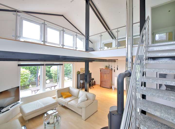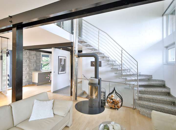 Lichtdurchflutetes Raumkonzept mit Galerie, edlem Parkett, Kaminofen und beeindruckenden Fensterfronten