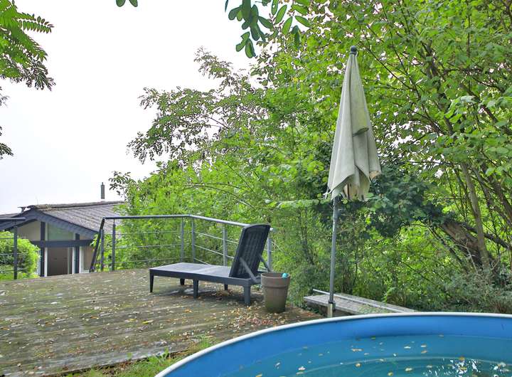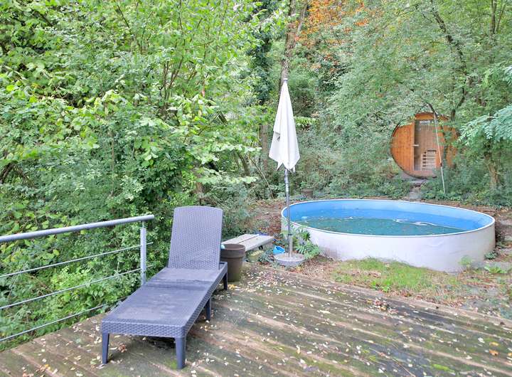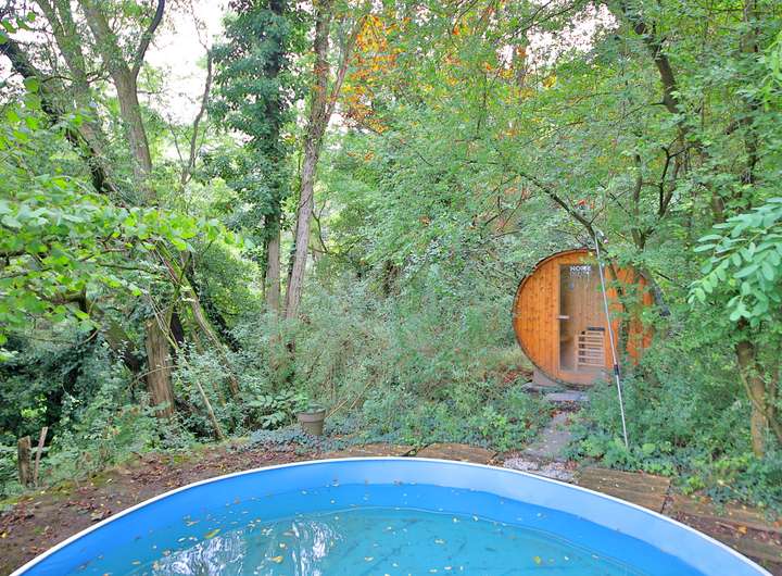 Traumhafter Wellnessgarten mit Außenpool, Fass-Sauna und überdachtem Sitzplatz samt Steingrill
