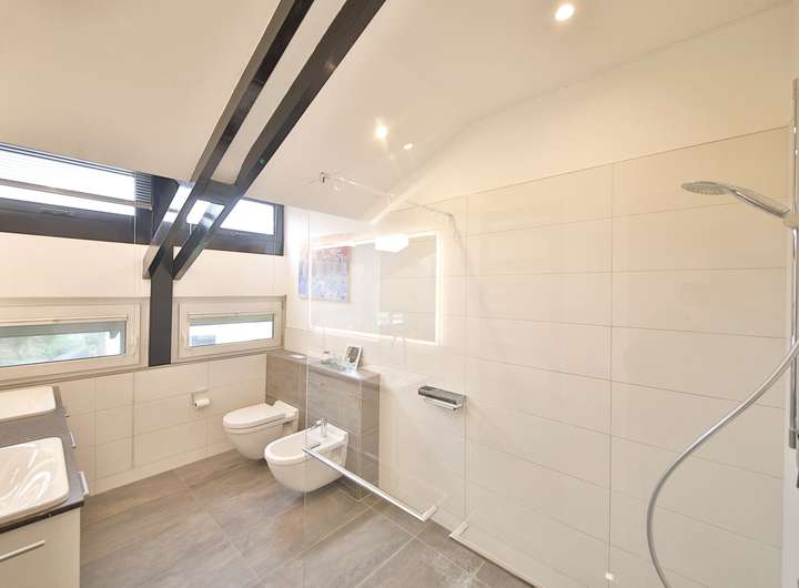 Design-Einbauküche und zwei exklusive Bäder mit ebenerdiger Dusche und Doppelwaschtisch