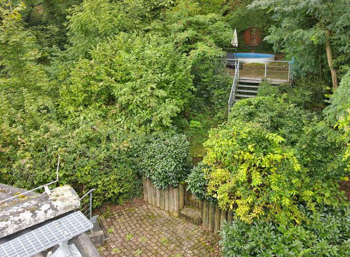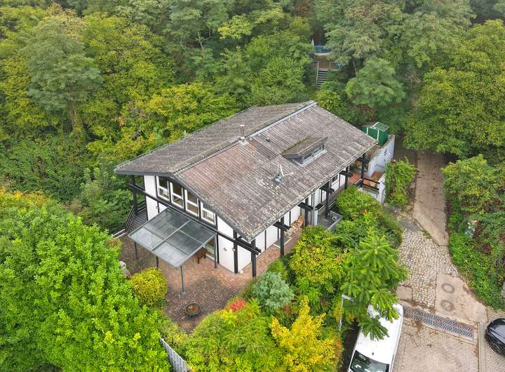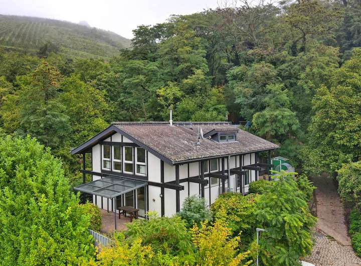 Das Anwesen befindet sich am Ende einer ruhigen Sackgasse direkt am Waldrand mit Blick auf die Weinberge – eine einmalige Lage in Zwingenberg, einem der begehrtesten Orte an der hessischen Bergstraße.