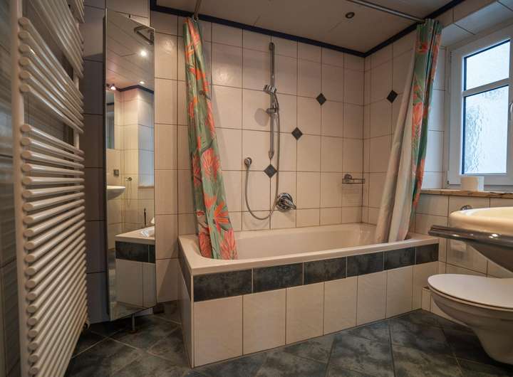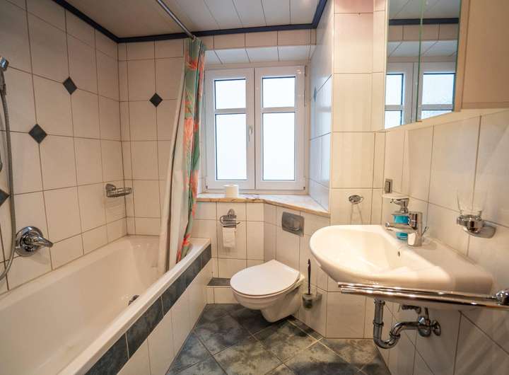 Das Tageslichtbad mit Duschwanne ist hell und pflegeleicht gestaltet.