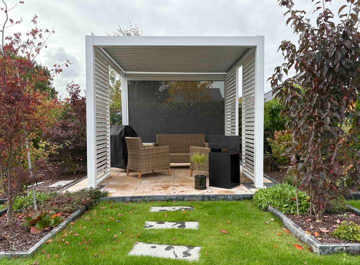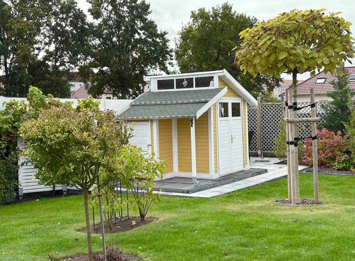 - Der Garten wartet mit blühenden Rabatten, einer hochwertigen Pergola sowie hölzernem Gartenhaus auf