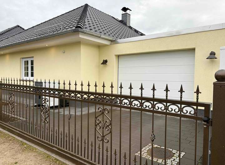 Stylische Zaunanlagen säumen das Grundstück. Auffahrt und Eingang werden von einer stilvollen, elektrischen Toranlage gesichert. An der Garagenrückseite befindet sich ein Zugang in den Garten. Seitlich gelangen Sie in den Hauswirtschaftsraum, welcher Platz für weitere Kühlbereiche und Lagerflächen bietet.