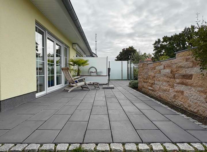 Modern und neuwertig präsentiert sich dieser schöne Bungalow, stilvoll eingebettet in einen Mix aus gewachsenem Wohngebiet und neuer Siedlung mit überwiegend Einfamilienhäusern und großzügigen Gärten. Das durchgehend ebenerdig gestaltete Einfamilienhaus wurde 2021 in massiver und hochwertiger Bauweise errichtet und präsentiert sich in neuwertiger Qualität. Die zeitlose und ästhetischen Architektur in Kombination mit einer inspirierenden Gartengestaltung, welche mit einigen Highlights aufwartet, erzeugt augenblicklich heimelige Atmosphäre. Der geschickt vor Einblicken und Wind geschützt angelegte Gartenbereich bietet Intimität und eine Oase der Ruhe. Eine gepflasterte Terrasse erstreckt sich an der Gebäuderückseite, flankiert von einer mediterran anmutenden, halbhohen Mauer, Blumenbeeten und Rasenfläche. Die isolierverglasten Fenster mit charmanten Sprossen unterstreichen das ländlich-moderne Flair.