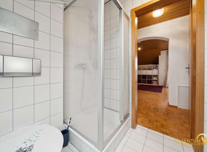 Das Tageslichtbad verfügt über eine Dusche, WC und Waschmaschinenanschluss. Die Wohnung ist mit hochwertigen Fliesen, Echtholzparkett und Laminatböden ausgestattet und präsentiert sich in einem gepflegten Zustand.