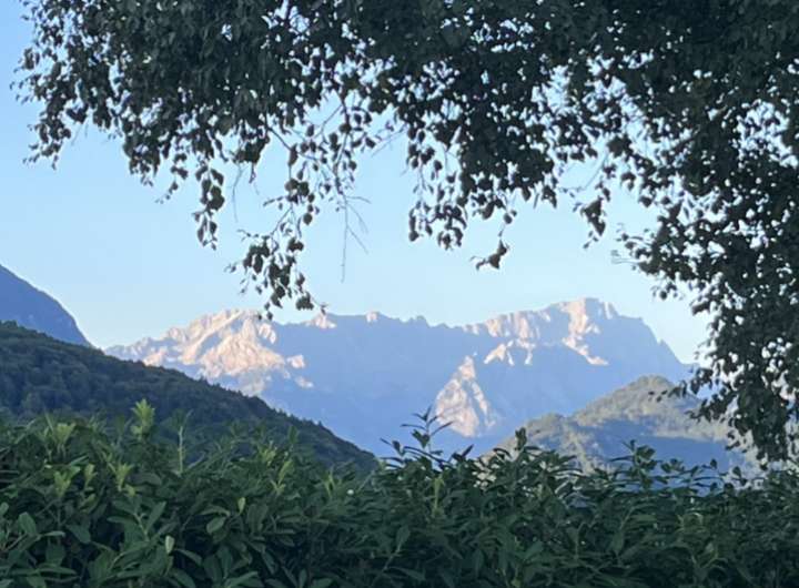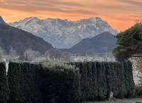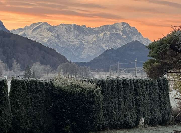 Vom Grundstück können der Sonnenaufgang im Osten über dem Heimgarten und auch der unverbaubare Ausblick auf das Wettersteingebirge im Süden von der Alpspitze bis zur Zugspitze genossen werden.