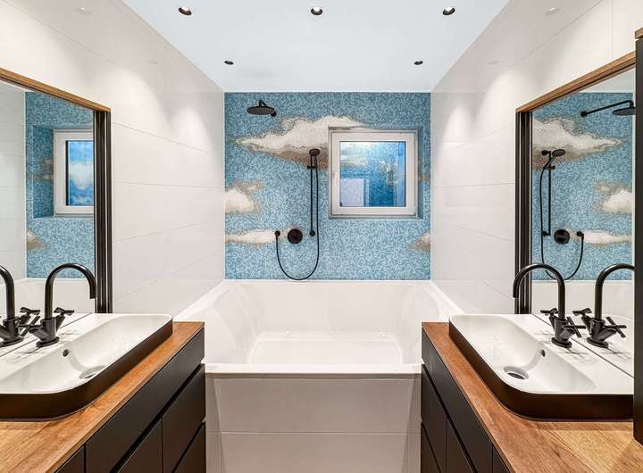 - Zwei über 16 m² große und gleichwertige Kinderzimmer, Kinder-Bad mit separatem WC, 2 Waschtischen und Mega-Badewanne für 2