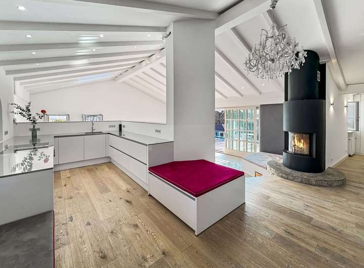 - offener Giebel im Lebensbereich (Wohnen, Essen, Küche, Master-Schlafen) mit bis zu ca. 4 m hoher Decke und Deckenspots