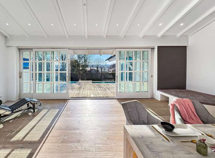 Genießen Sie jeden Tag ein perfektes Raumangebot, hohe Decken, einen wunderschönen Winterseeblick, phantastische Sonnenuntergänge und ein Sichtfenster auf die Zugspitze! Einbauschränke, Sitzbänke und vielfältige, großzügige Abstellflächen sorgen für ein aufgeräumtes, klares und sehr gehobenes Wohngefühl. Nahezu jeder Raum ist individuell gestaltet und ausgerichtet mit weiten Blickachsen in den professionell angelegten Garten und auf die Seeseite. Hier kann man Licht, Sonne und Schatten genießen, Sonnenuntergänge zelebrieren und die längste Sonnenscheindauer erleben auf den vielfältigen Terrassen und in den sehr großen Wohn- und Schlafräumen.