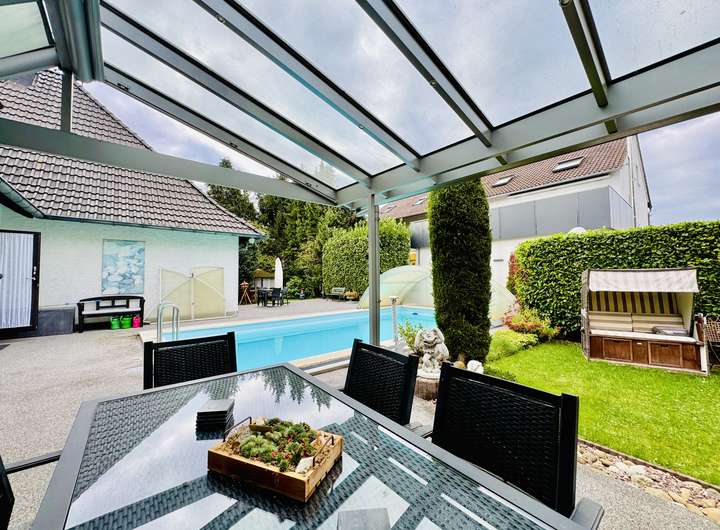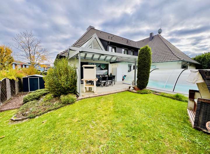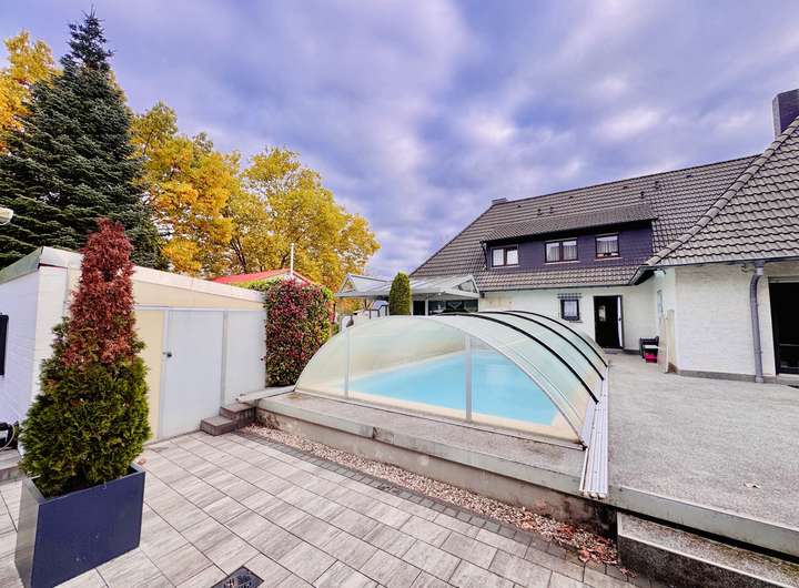 Das Grundstück ist liebevoll gestaltet und bietet mit seinem überdachten und beheizbaren Außenpool ein echtes Highlight. Der Pool ist mit einer Schiebehalle ausgestattet, die sich