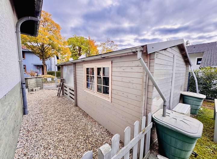 Das große Gartenhaus, ein Holzschuppen sowie ein zusätzlicher Geräteraum bieten reichlich Platz für Gartengeräte, Werkzeuge und Freizeitutensilien. Der Garten lädt zum Entspannen und Verweilen ein, sichtgeschützt und pflegeleicht angelegt.