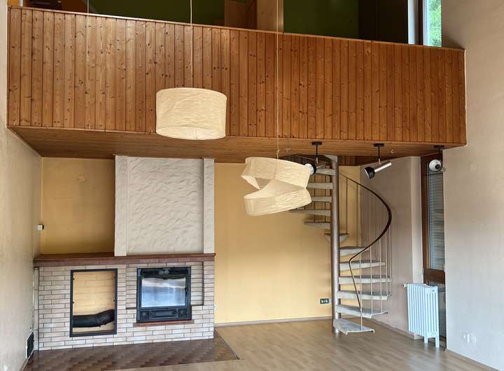 Die Hauptwohnung verteilt sich auf 2 Etagen und bietet neben einer großen Wohnküche ein großzügiges Wohnzimmer mit Panoramablick sowie einer Galerie und Kamin und eine großzügig gehaltene Wohn-Küche mit Zugang zur Terrasse.