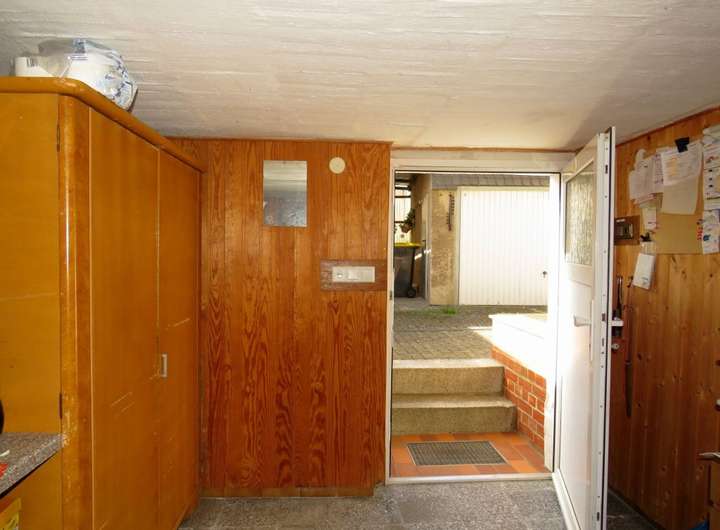 Vom Keller gibt es einen Zugang zum Grundstück, im rückliegenden Bereich.