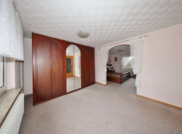 Über die geschwungene Treppe im Flur gelangen Sie in das Obergeschoss. Hier befinden sich drei weitere Zimmer sowie ein zweites Bad mit Dusche und WC. Besonders hervorzuheben ist das großzügige Schlafzimmer: Aufgrund des Durchbruchs wurde es in zwei Bereiche gegliedert perfekt für die Einrichtung eines Ankleidezimmers oder eines Rückzugsbereiches.
