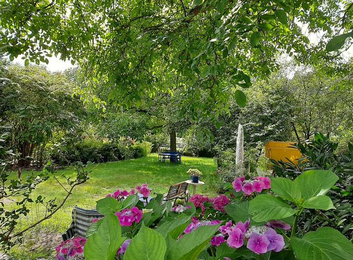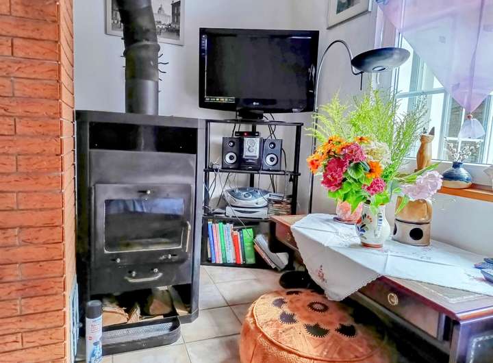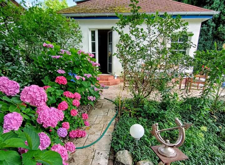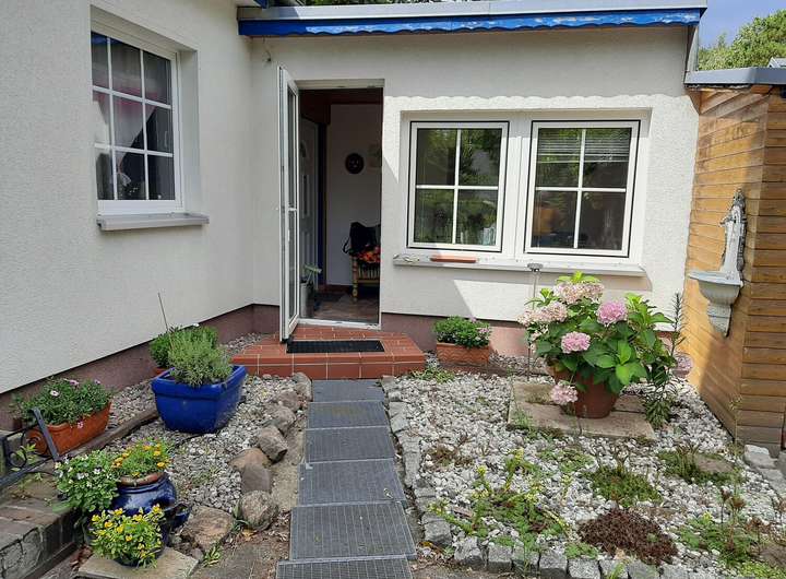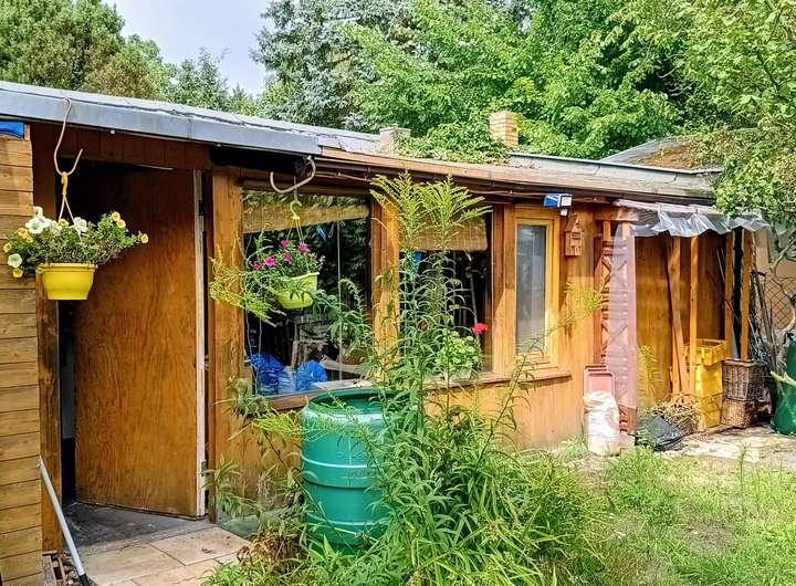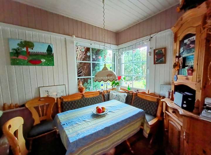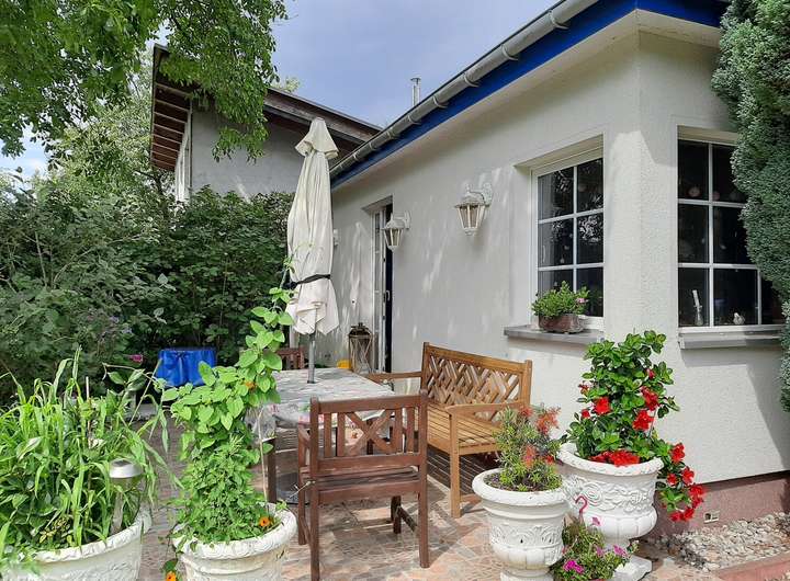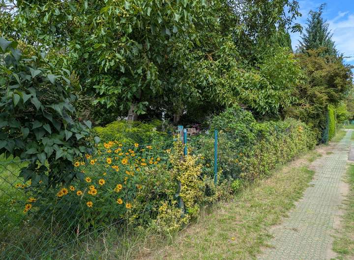 Auf dem Grundstück befindet sich ein Wochenendhaus in massiver Ständerbauweise, das im Jahr 1939 errichtet wurde. Das eingeschossige Gebäude bietet eine Wohnfläche von etwa 50 bis 60 Quadratmetern, verteilt auf zwei Zimmer, eine kleine Einbauküche sowie ein Badezimmer mit Dusche. Eine Terrasse mit Blick in den Garten lädt zum Verweilen ein, während ein Kamin im Inneren für gemütliche Stunden sorgt.