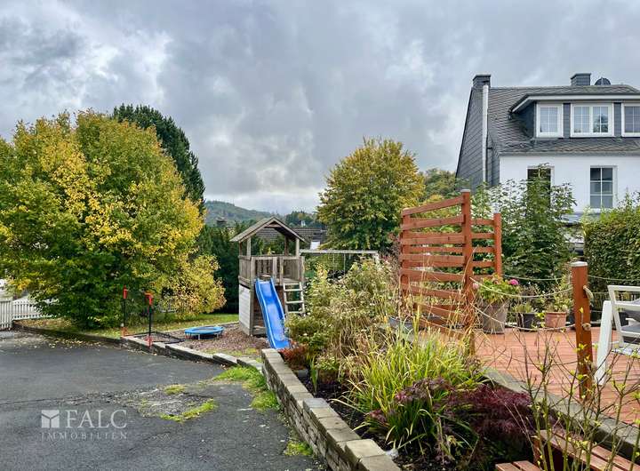 Der liebevoll gestaltete Garten mit Klettergerüst und Holzterrasse lädt zum Spielen, Entspannen und Verweilen ein und bietet reichlich Platz für vielfältige Aktivitäten im Freien.