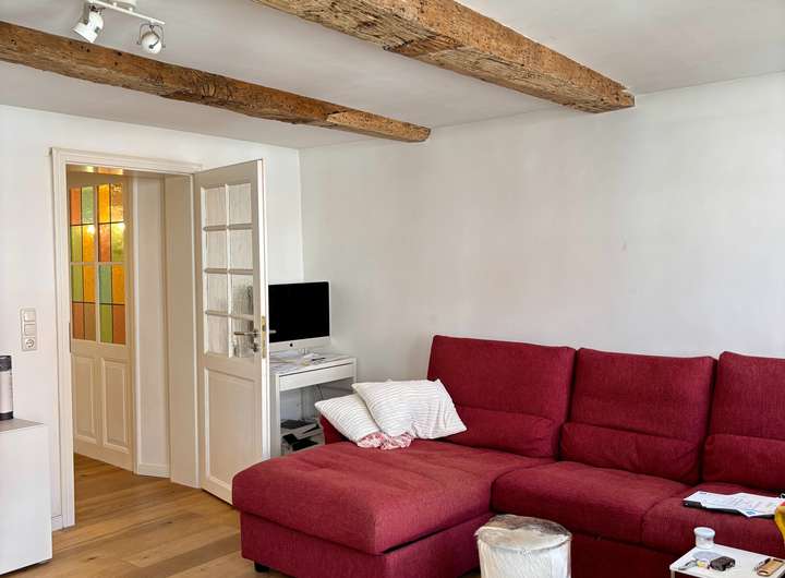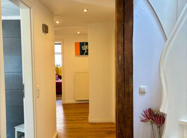 Das 1. Obergeschoss bietet ein großzügiges Wohnzimmer mit einem zweiten Kaminofen und herrlicher Altstadtatmosphäre. Im Flurbereich sorgen tragende Holzbalken und moderne Deckenstrahler für eine gelungene Verbindung von Tradition und Moderne. Ebenfalls auf dieser Etage befinden sich das Hauptschlafzimmer, ein modernisiertes Duschbad mit Tageslicht sowie ein separater Hauswirtschafts- bzw. Heizungsraum.
