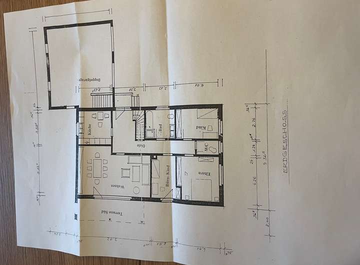—> im Zuge der Sanierung wurde eine Wand entfernt. Diese stand zwischen „Wohnen“ & „Büro -Kind“, im Grundriss EG zu sehen
