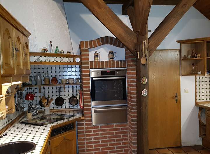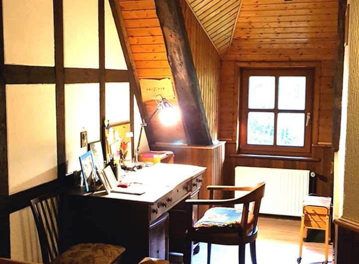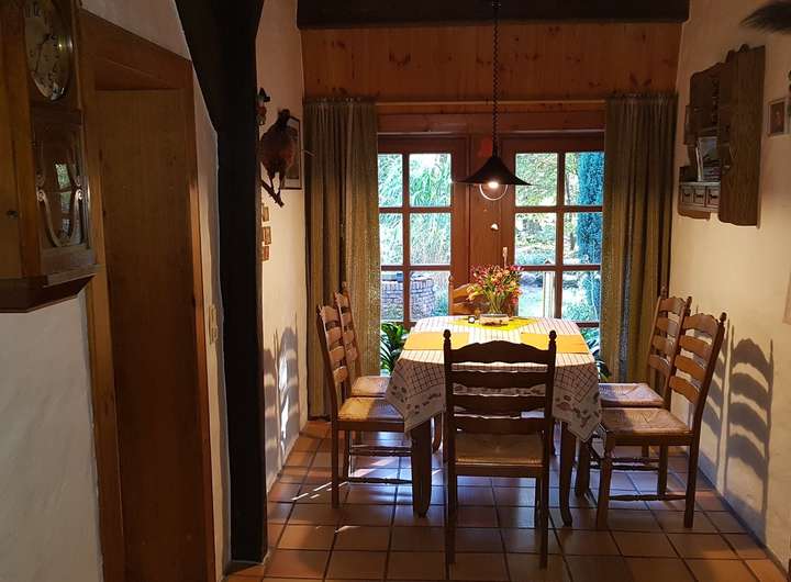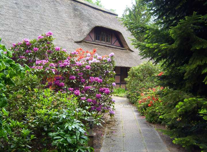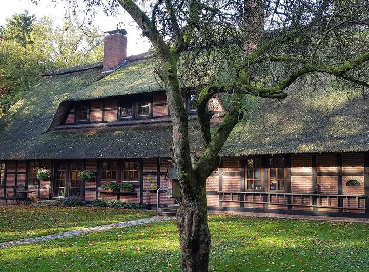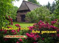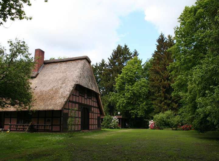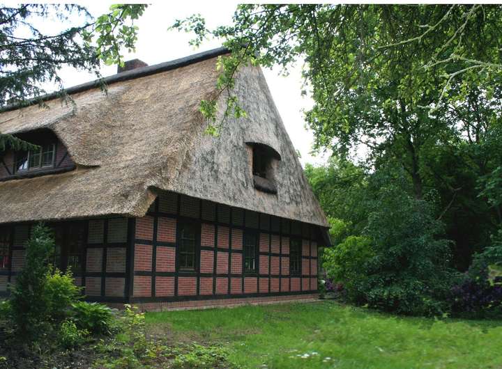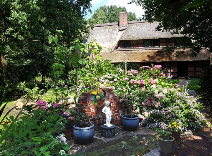 Dieses wunderschöne und exklusive Fachwerkhaus mit Reetdach steht mitten in einem grossen, waldähnlichen Grundstück.