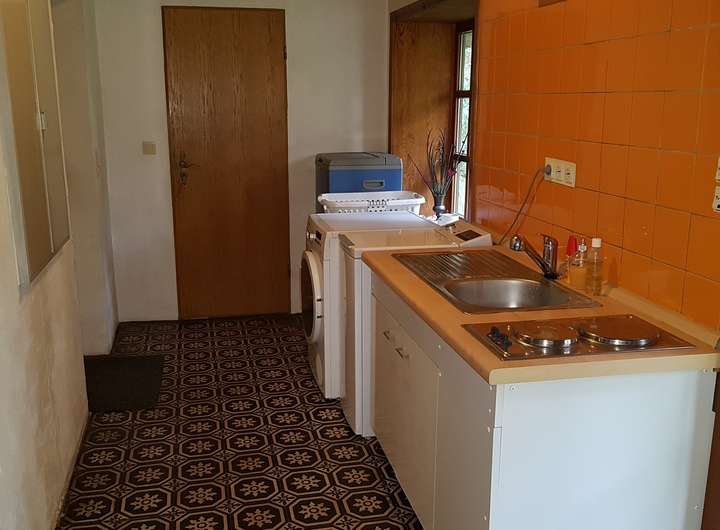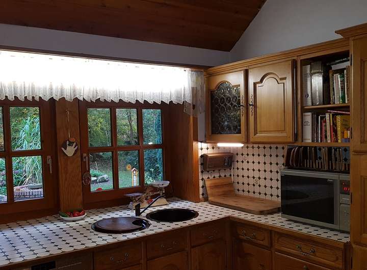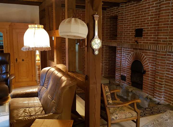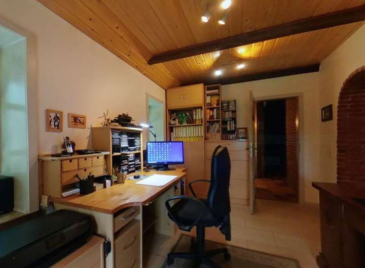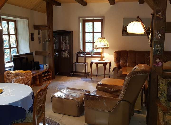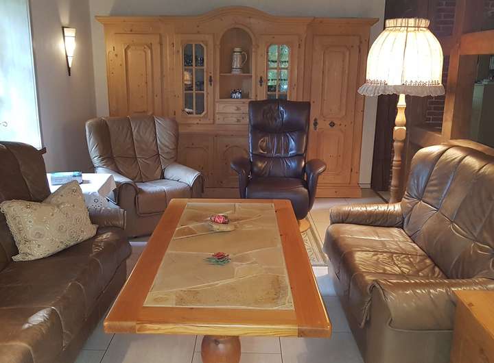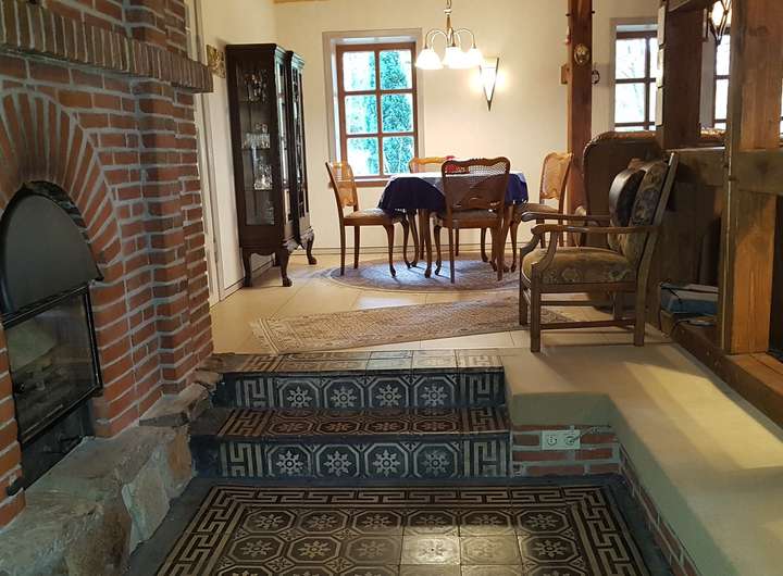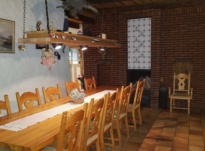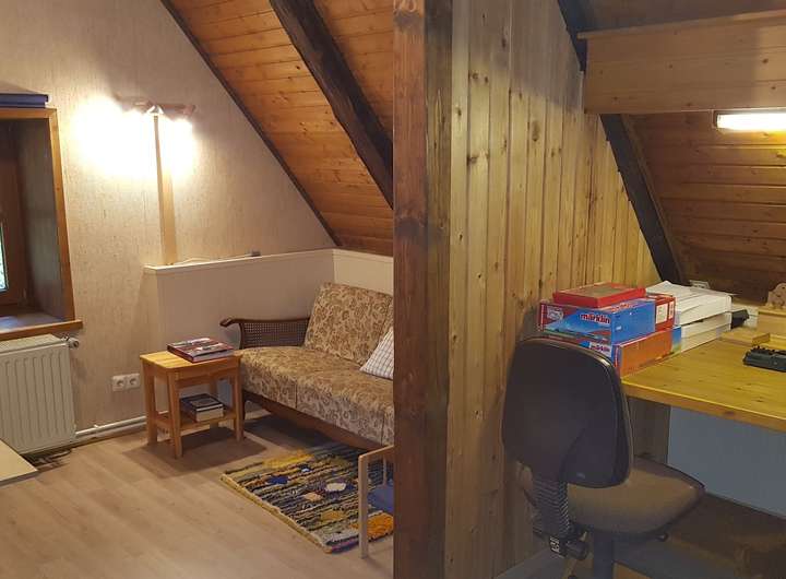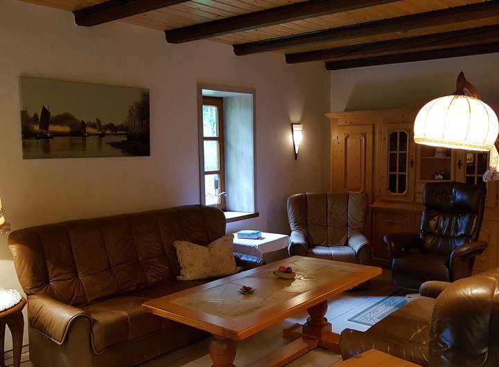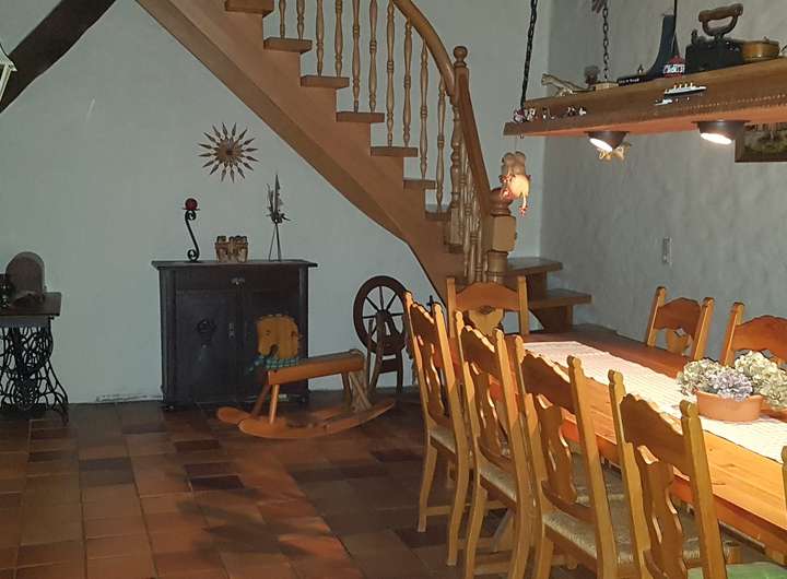 Das charmante Haus verfügt mit 7 Zimmern, 2 Bädern und einer sehr grossen Essdiele über viel Platz. Speziell die wohnliche Essdiele mit 3,5m Tisch für 12 Personen und offenem Kamin sowie Holztreppe bietet sich für gemütliche Runden geradezu an. Bemerkenswert sind auch die vielen sichtbaren Holzkonstruktionen, besonders die Höftständer. Entspannung pur verspricht der Aufenthalt in der Sitzmulde vor dem Stubenkaminfeuer oder aber die Nutzung der hauseigenen Sauna mit Tauchbecken und Schwalldusche.